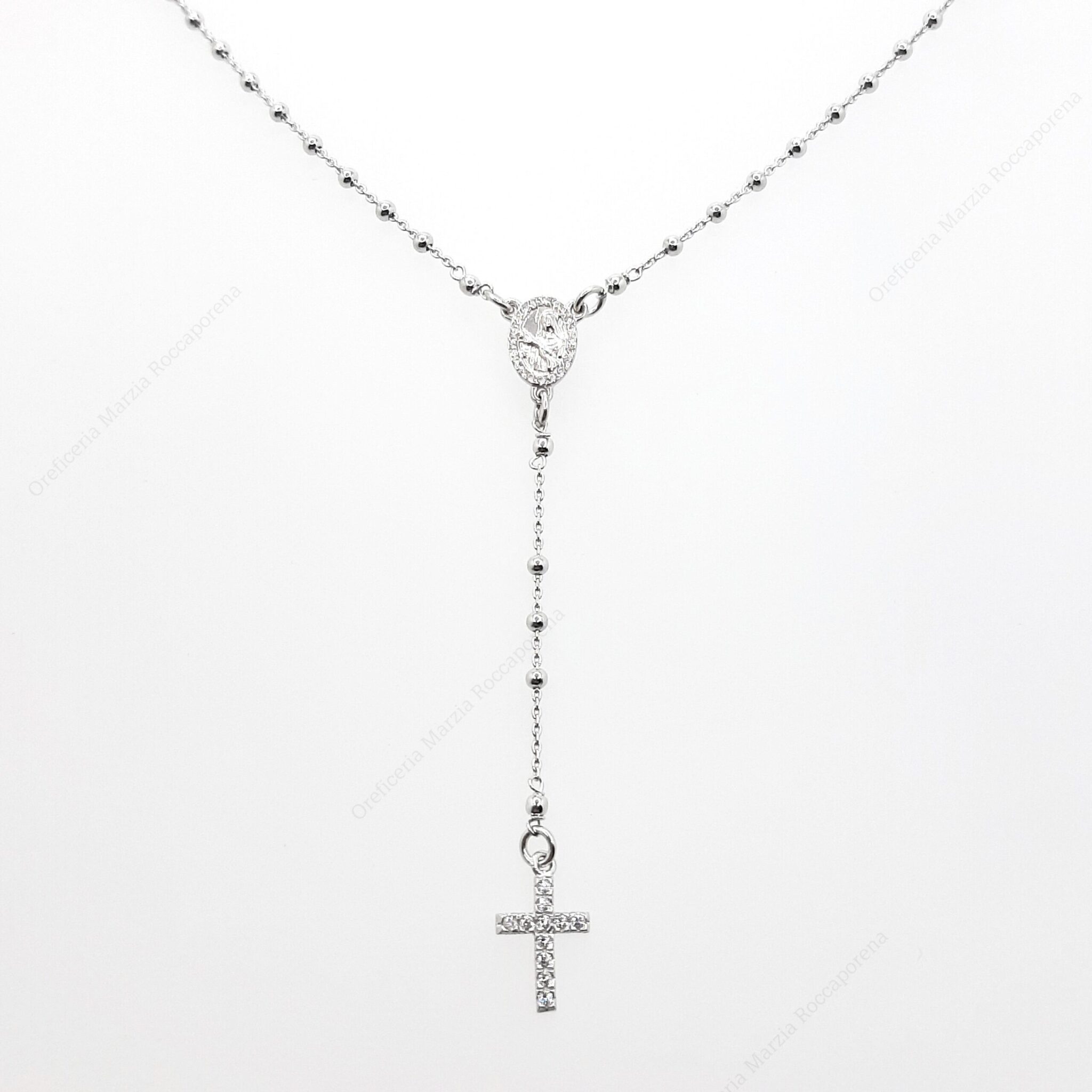 Rosario con Santa Rita e zirconi intorno alla medaglia e sulla croce pendente, realizzato in argento 925.